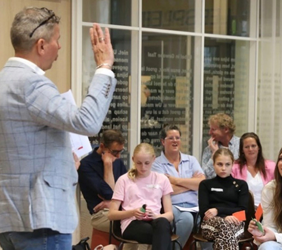 Leerlingen zaten hierbij in de binnenring van de ‘arena’ en een grote groep docenten in de buitenring. Deze laatsten mochten alleen een luisterend oor hebben.