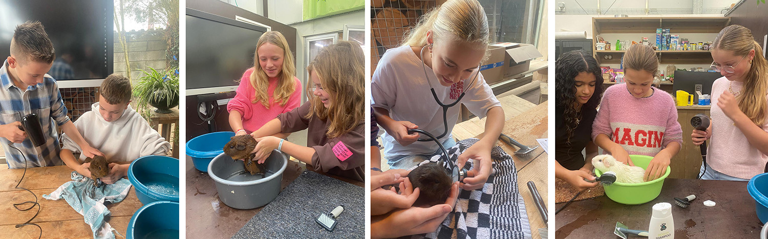 De cavia’s werden flink in de watten gelegd: ze kregen een verfrissend bad, werden zorgvuldig geföhnd en kregen daarna een borstelbeurt. Als kers op de taart maakten de leerlingen een kleurrijke groente- en fruitketting als traktatie – dat viel duidelijk in de smaak!
